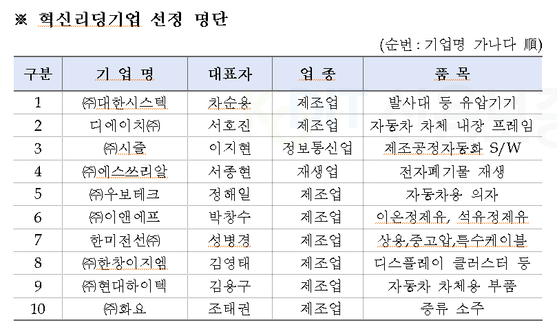 ‘혁신리딩기업’에는 ▲유압기기를 제조하는 ‘(주)대한시스텍’ ▲자동차 차체 내장프레임을 제조하는 ‘디에이치(주)’ ▲제조공정자동화 S/W를 제작하는 ‘(주)시즐’ ▲전자폐기물을 원료로 재생스크럽을 제조하는 ‘(주)에스쓰리알’ ▲자동차용 의자를 제조하는 ‘(주)우보테크’ ▲이온정제유 제조기업 ‘(주)이앤에프’ ▲상용, 중고압케이블 생산기업 ‘한미전선(주)’ ▲차량용 디스플레이 클러스터를 생산하는 ‘(주)한창이지엠’ ▲자동차 차체용 부품 제조기업 ‘(주)현대하이텍’ ▲증류식 소주를 생산하는 ‘(주)화요’가 선정됐다.